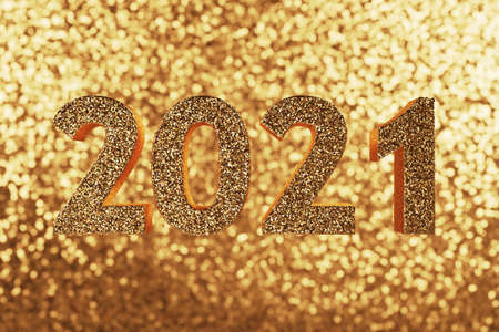 Number 2021 on wooden block with Christmas light bokeh
