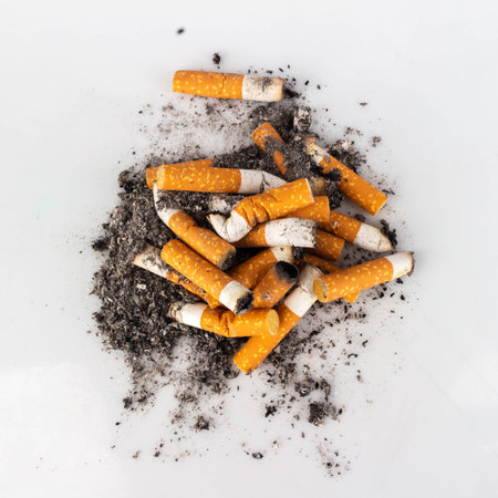 Cigarette butts and ashes on white background. Copy space
