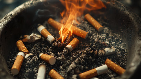A crowded ashtray full of cigarette butts, with one cigarette still burning on top, ash accumulating around it in a messy yet detailed scene.