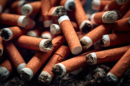 A pile of extinguished and crumpled cigarettes, cigarette burning and tobacco smoke, dark background, World No Tobacco Day