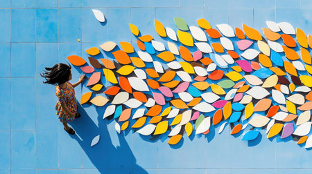 A woman stands amidst a cascade of colorful paper leaves, creating a vibrant and artistic scene.