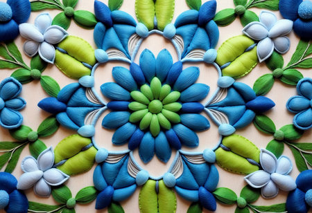 A stunning textile arrangement showcases various shades of blue, green, and white, forming a vibrant floral pattern. Each petal and leaf is meticulously placed, creating a harmonious visual.