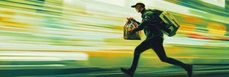Courier runs swiftly with a grocery bag, embodying energy and urgency in a vibrant urban setting with blurred colors and dynamic motion effects
