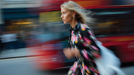 A woman in a blazer and leggings runs through a city, her movement creating a blur effect against the background.