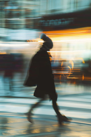 A woman walks briskly through a city street during dusk, her yellow jacket and scarf catching the wind. The background is blurred, highlighting her swift movement and focused expression.