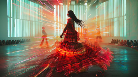 The photo shows a woman dancing in a colorful dress. The background is a blur of light and color. The woman is wearing a red and orange dress with a long flowing skirt. She has her arms outstretched and is spinning around. Her hair is long and flowing. The photo is taken from a low angle, making the woman look taller and more imposing. The colors in the photo are vibrant and saturated, giving it a dreamlike quality.