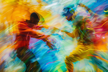 A Swirling colors create energetic atmosphere, capturing essence of movement and excitement