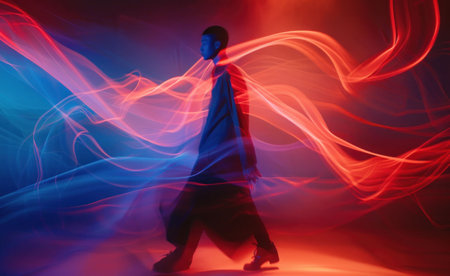 Abstract Motion Blur Background with Person Walking Through Swirling Red and Blue Lights