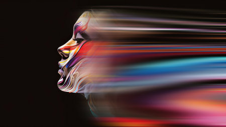 A young individual in profile, showcasing vibrant blue and yellow abstract patterns swirling around against a light background