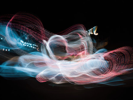 Dynamic light trails with blurred motion create a mesmerizing effect on a dark backdrop