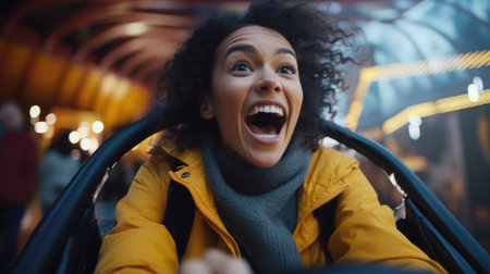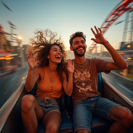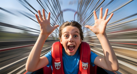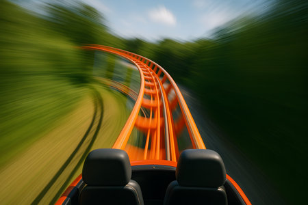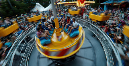 An exhilarating roller coaster ride captures passengers enjoying an adrenaline-filled experience. Motion blur adds excitement, highlighting the thrill and joy of amusement parks.