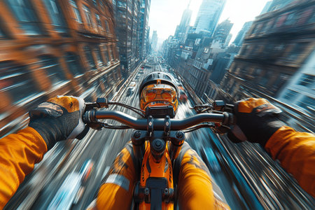 A dynamic shot of a cyclist speeding through a lush forest trail, the motion blur emphasizing the exhilaration and freedom of outdoor sports.
