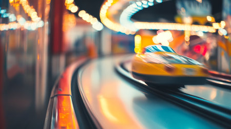 A captivating image showing the dynamic motion of a roller coaster, with vibrant lights and thrilled riders, capturing the essence of fun and excitement at an amusement park.