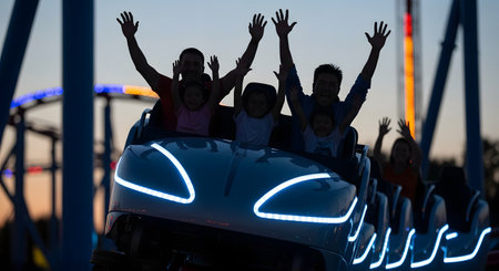 A joyful family with young children raises their hands in excitement while riding a modern roller coaster with bright blue LED lights at night. Their happy expressions are silhouetted against the glowing lights of the amusement park, capturing a moment of thrilling family fun and entertainment. The dynamic shot conveys speed and pure enjoyment.