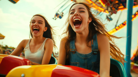 Two young women laugh with excitement while riding a roller coaster at an amusement park, enjoying the thrill and fun of the moment