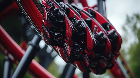 Capture the thrill of amusement parks with this dynamic close-up of red roller coaster cars racing down a steel track under an overcast sky, evoking feelings of excitement and adventure.