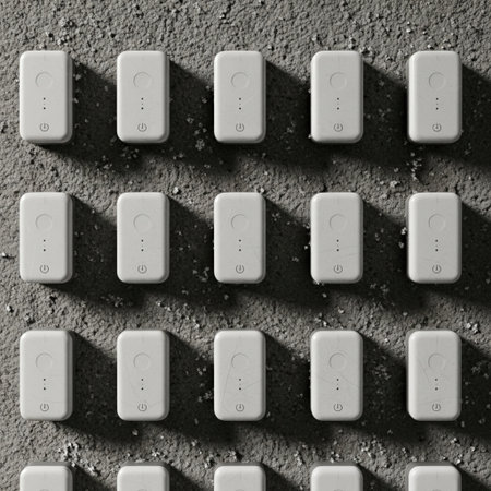 A minimalist flatlay featuring rectangular portable battery packs in various sizes and colors, perfect for showcasing modern technology and utility design.