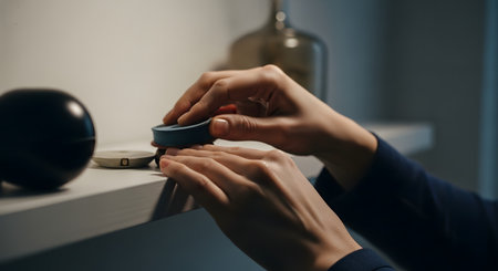 Close-up of hands carefully adjusting or placing small decorative items on a white shelf. The focus is on organization, interior styling, or interacting with home accessories.