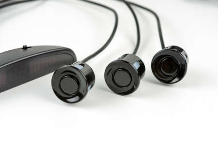 Electronic collection - remote controlled parking sensor and display screen. Close-up on white background