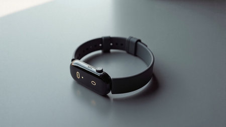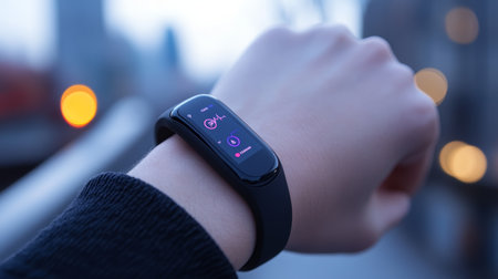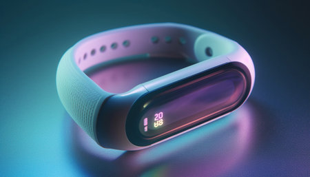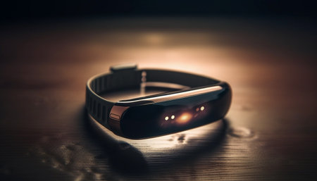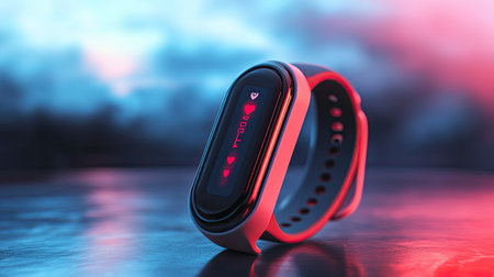 This fitness tracker displays health metrics in a dimly lit environment, showcasing its sleek design and technology.