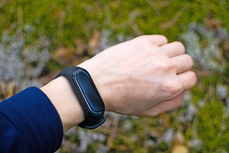 Black fitness bracelet for sports training on a girls hand on a natural background. Sports in the forest. Selective focus.