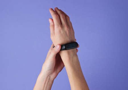 Woman wearing intelligent health watch on her wrist. Close up view.