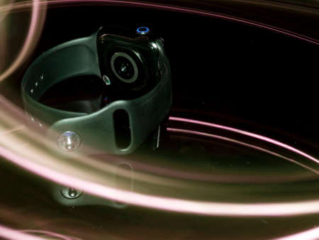 A modern smartwatch displayed on a sleek surface with vibrant lighting effects