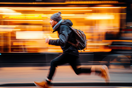 A businessman races through a vibrant urban landscape, embodying speed and determination in a blurred city scene, symbolizing effective and quick solutions in a modern world.