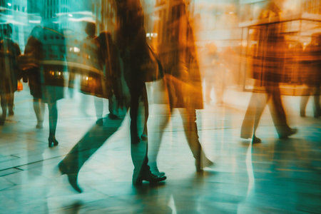 A dynamic photo capturing the ghosting effect of people walking in a busy urban setting, illustrating the motion and vibrancy of city life.