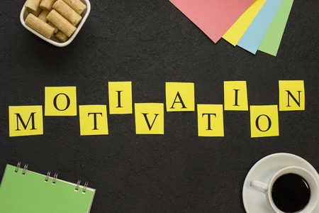 Motivation horizontal inscription. Checkered letters printed on yellow papers, blank notebook, coffee, cookies and note papers. Black concrete background. Space for your text or image. Top view.