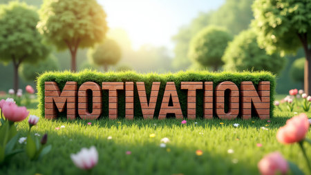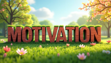 Bold MOTIVATION is made of bricks grass in a digital spring garden with trees flowers