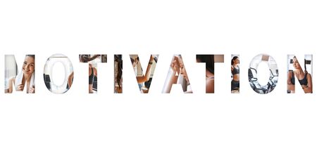 Working out. Sporty caucasian woman doing different sport exercises at gym with an overlay of the word MOTIVATION. Isolated on white background. Panoramic banner header. Fitness