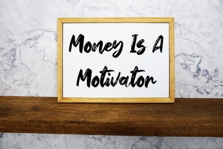 Blackboard with text Money Is A Motivator on a wooden shelf, set against a marble wall.