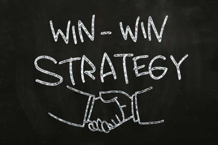 Win Win Strategy quotes and hand shakes, drawn with Chalk on Blackboard