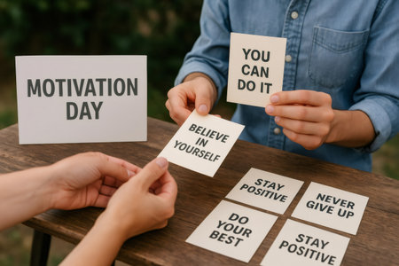 Hands exchanging cards with motivational quotes like believe you can and you're halfway there celebrating motivation day