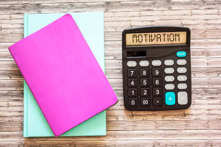 Text Motivation on a calculator, near notepads on a wooden table. Business concept