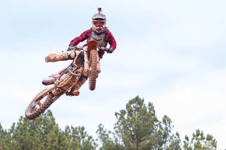 Monroe, GA, USA - December 3, 2016: A rider poses in midair after going over a jump in a motocross race at the Scrubndirt Track on December 3, 2016 in Monroe, GA.