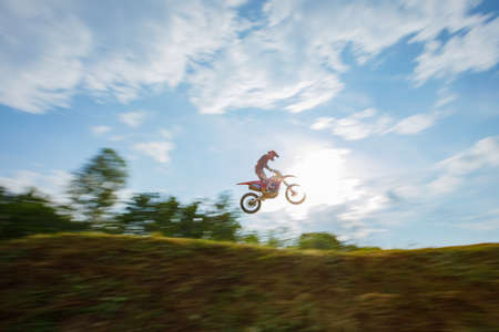 Racer on motorcycle dirtbike motocross cross-country in flight, jumps and takes off on springboard against sky. Concept active extreme rest