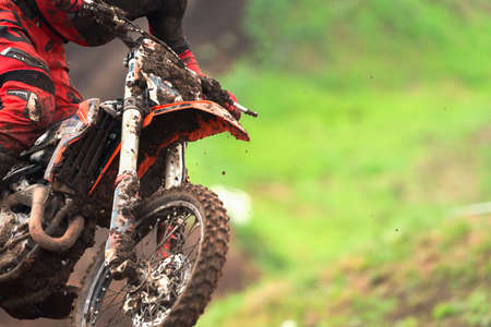Unrecognized Athlete riding a sports motorbike and muddy wheel on a motocross racing event