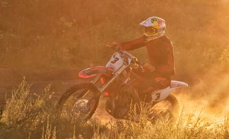 Kiev, Ukraine - July 16, 2017: Kid on motorcycle going thru dirt, during Championship of Ukraine on cross-country final stage.
