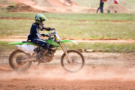 Racer boy on motorcycle participates in motocross race, active extreme sport, flying debris from a motocross in dirt track
