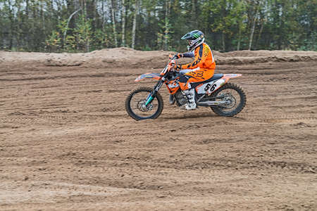 Arnoldsweiler, Germany, October 05,2017: Extreme Motocross MX Rider riding on dirt track on a sunny late summer day on public training session in preparation for motocross event.
