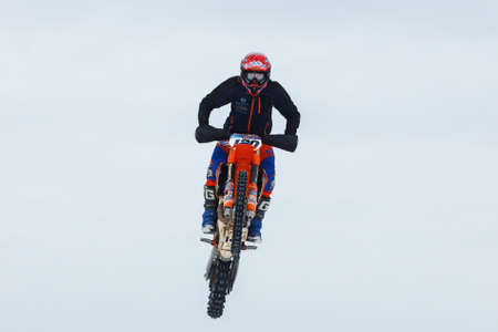 Russia. Vyborg. 02.23.2021 motorcyclist in flight after ski jump
