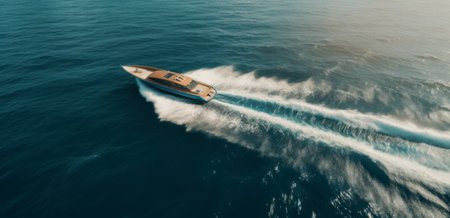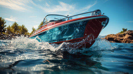 Captivating aerial view of a motorboat slicing through the vibrant blue waters, creating splashes and wakes, embodying the spirit of summer adventures.