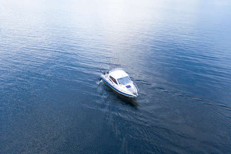 Aerial view of motor boat sailing in the sea. Amazing seascape with the fishing boat.