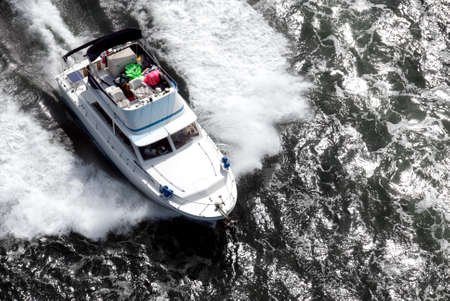 A white speedboat, with a very untidy upper deck, shot from above while travelling fast.