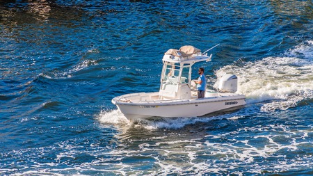 New Bedford, Massachusetts, USA - April 28, 2019: Powerboat crossing choppy New Bedford outer harbor