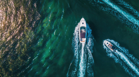 Two motorboats are captured from above, navigating through vibrant turquoise water. The image showcases the vessels' white hulls against the deep blue and green hues of the ocean. The perspective offers a unique view of the boats' trails and surrounding marine environment, suitable for various commercial uses.