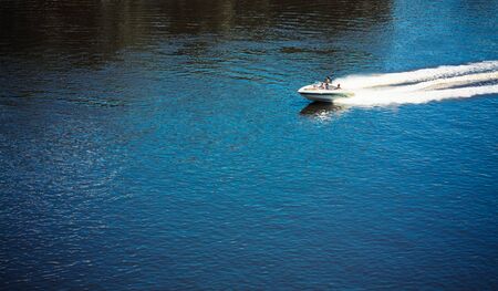 Russia, Moscow August 2018. Small high-speed boat sails on the river channel of Moscow