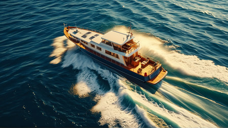 An overhead view captures a boat moving swiftly through the water. The image displays a boat with passengers creating a foamy wake against the darker ocean. The composition, using natural lighting, may be suitable for nautical themes and illustrating travel or adventure concepts.